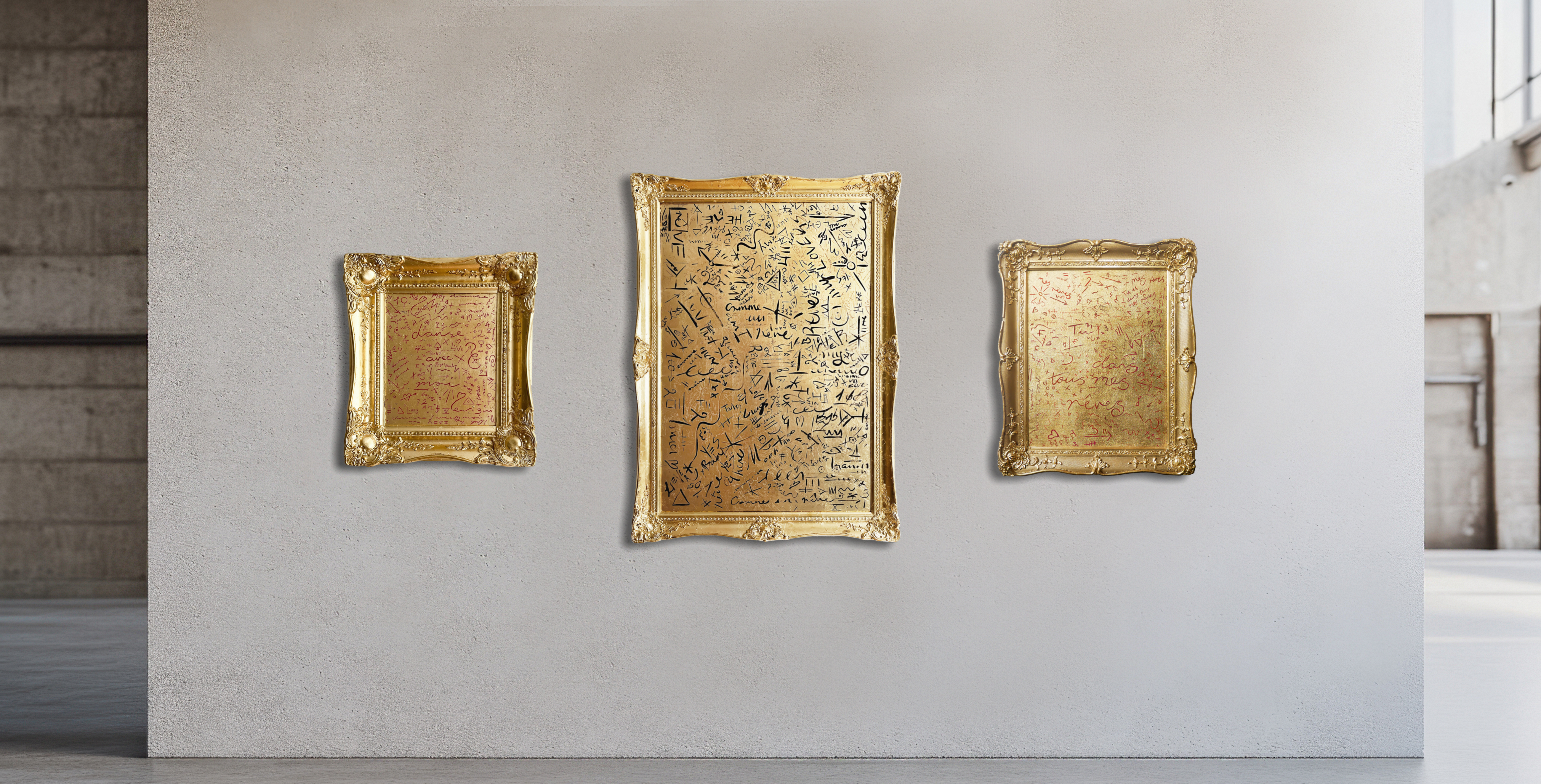 Storey’s paintings fuse symbolism with expressive techniques, focusing on reflective surfaces, gold and silver leaf create a mesmerising glow.